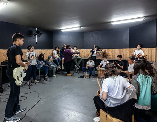 Sala acústica equipada com aparelhagem e instrumentos utilizados nas aulas de música, oficina de sons e ampliação da cultura musical dos alunos.